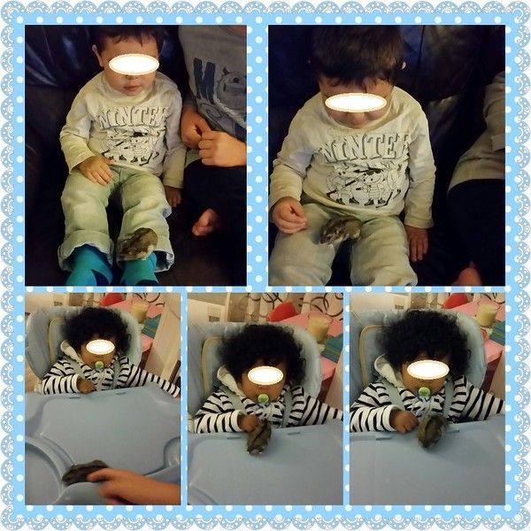 Ce matin quand Kylian s'est réveillé il adore prendre ses hamster et il les fait toujours voir aux loulous et ils adorent Maël l'a même pas touché mdr et Théo l'a laissé marcher sur lui